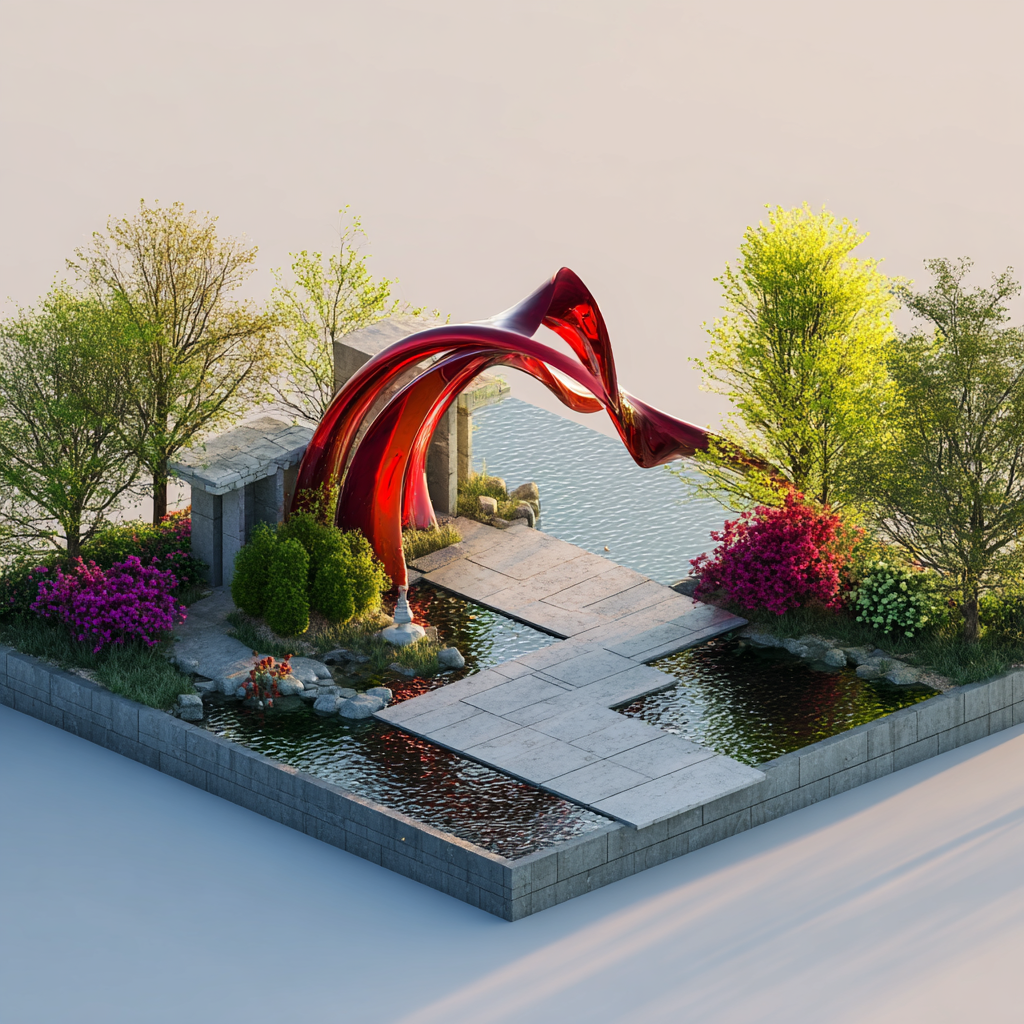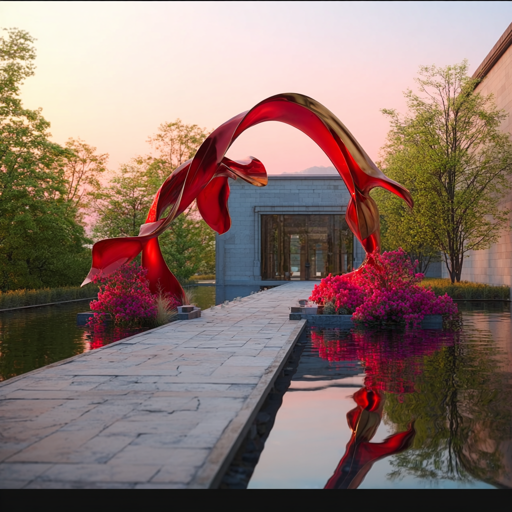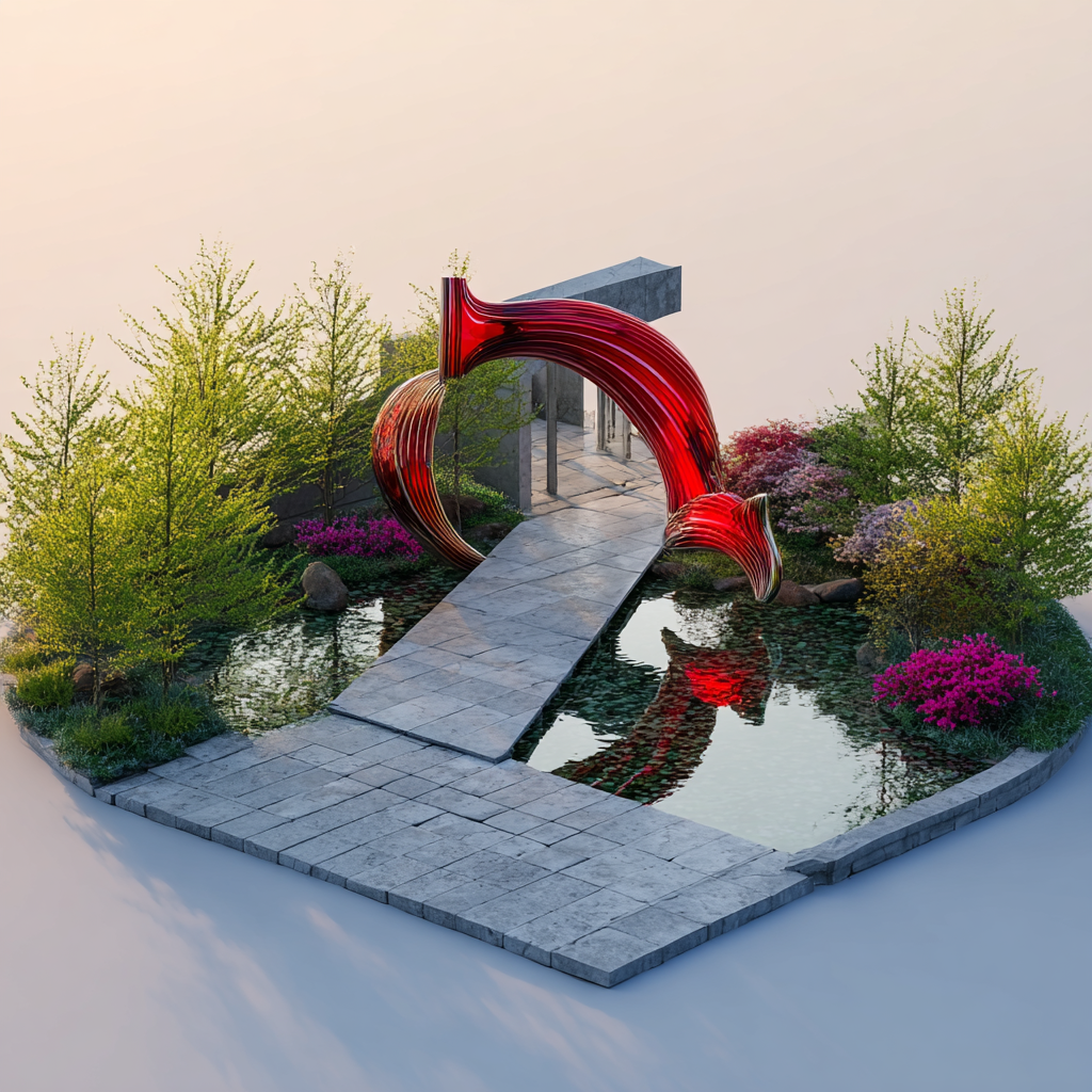 { "style": "isometric 3D render, realistic diorama style", "theme": "modern art installation and tranquil landscape", "location": "Museum SAN Entrance, Oak Valley, Wonju, Korea", "object_count": "one main sculpture with surrounding landscape", "scene_elements": { "structure": { "type": "realistic red abstract sculpture in arch formation", "materials": ["smooth, glossy red-painted metal"], "features": ["intertwined organic shapes", "arching form over pathway", "reflective curved surfaces"] }, "landscape": { "terrain": "stone-paved walkway across shallow mirror pool", "vegetation": ["realistically rendered spring trees", "blooming azaleas", "natural bushes with mixed green foliage"], "pathway": "long, rectangular path made of pale gray stone tiles leading directly to museum building" }, "environment": { "base": "realistic mini-diorama base with shallow water reflecting the sculpture and sky", "background": "soft, gradient sunset sky with pastel pink and blue hues, creating a calm and peaceful mood" } }, "lighting": { "type": "realistic golden hour lighting", "shadows": "soft and elongated shadows cast by sculpture and trees", "highlights": "subtle metallic gleam on sculpture and crisp reflections on water surface" }, "rendering": { "camera_angle": "isometric perspective with slight top-down tilt", "composition": "centered sculpture over water path, with museum building in background", "quality": "ultra-realistic rendering with miniature model aesthetics, sharp details and soft depth-of-field effect" } } 이미지 생성해