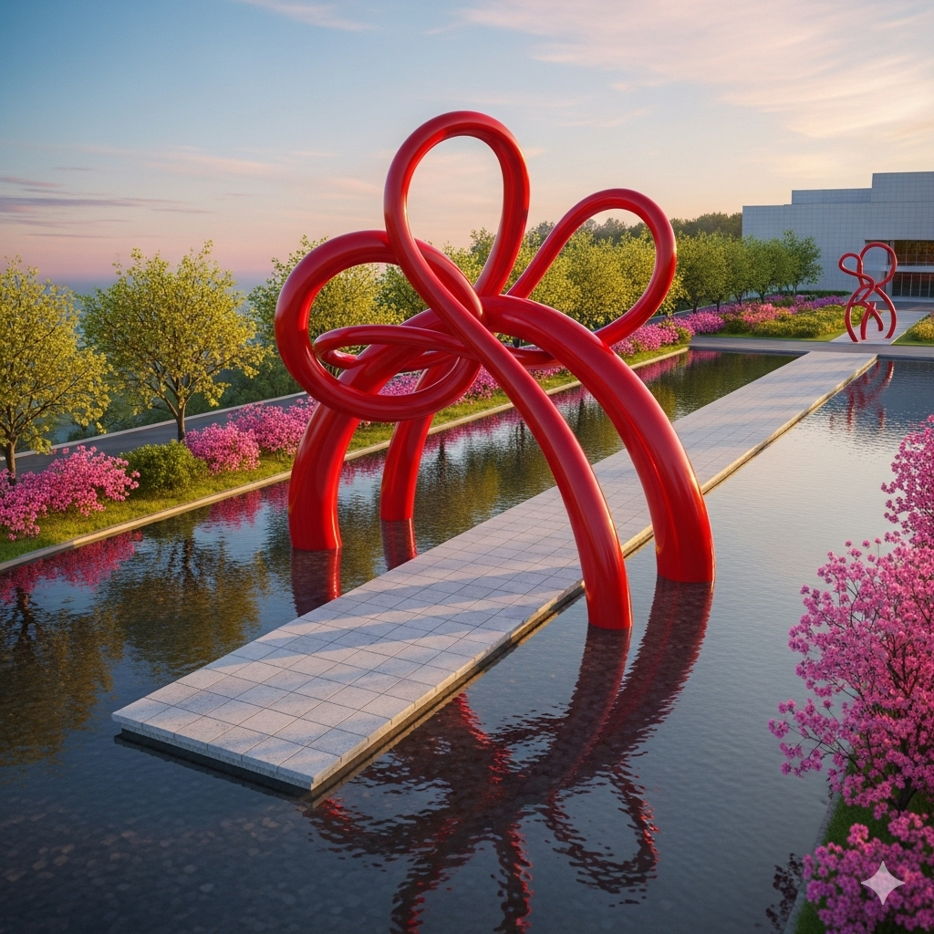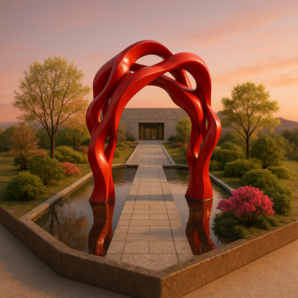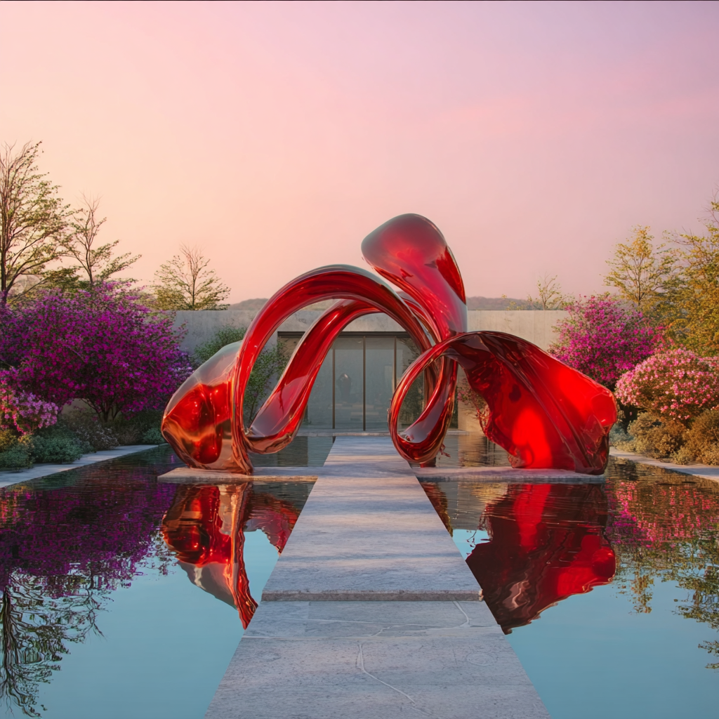 { "style": "isometric 3D render, realistic diorama style", "theme": "modern art installation and tranquil landscape", "location": "Museum SAN Entrance, Oak Valley, Wonju, Korea", "object_count": "one main sculpture with surrounding landscape", "scene_elements": { "structure": { "type": "realistic red abstract sculpture in arch formation", "materials": ["smooth, glossy red-painted metal"], "features": ["intertwined organic shapes", "arching form over pathway", "reflective curved surfaces"] }, "landscape": { "terrain": "stone-paved walkway across shallow mirror pool", "vegetation": ["realistically rendered spring trees", "blooming azaleas", "natural bushes with mixed green foliage"], "pathway": "long, rectangular path made of pale gray stone tiles leading directly to museum building" }, "environment": { "base": "realistic mini-diorama base with shallow water reflecting the sculpture and sky", "background": "soft, gradient sunset sky with pastel pink and blue hues, creating a calm and peaceful mood" } }, "lighting": { "type": "realistic golden hour lighting", "shadows": "soft and elongated shadows cast by sculpture and trees", "highlights": "subtle metallic gleam on sculpture and crisp reflections on water surface" }, "rendering": { "camera_angle": "isometric perspective with slight top-down tilt", "composition": "centered sculpture over water path, with museum building in background", "quality": "ultra-realistic rendering with miniature model aesthetics, sharp details and soft depth-of-field effect" } } 이미지 생성해