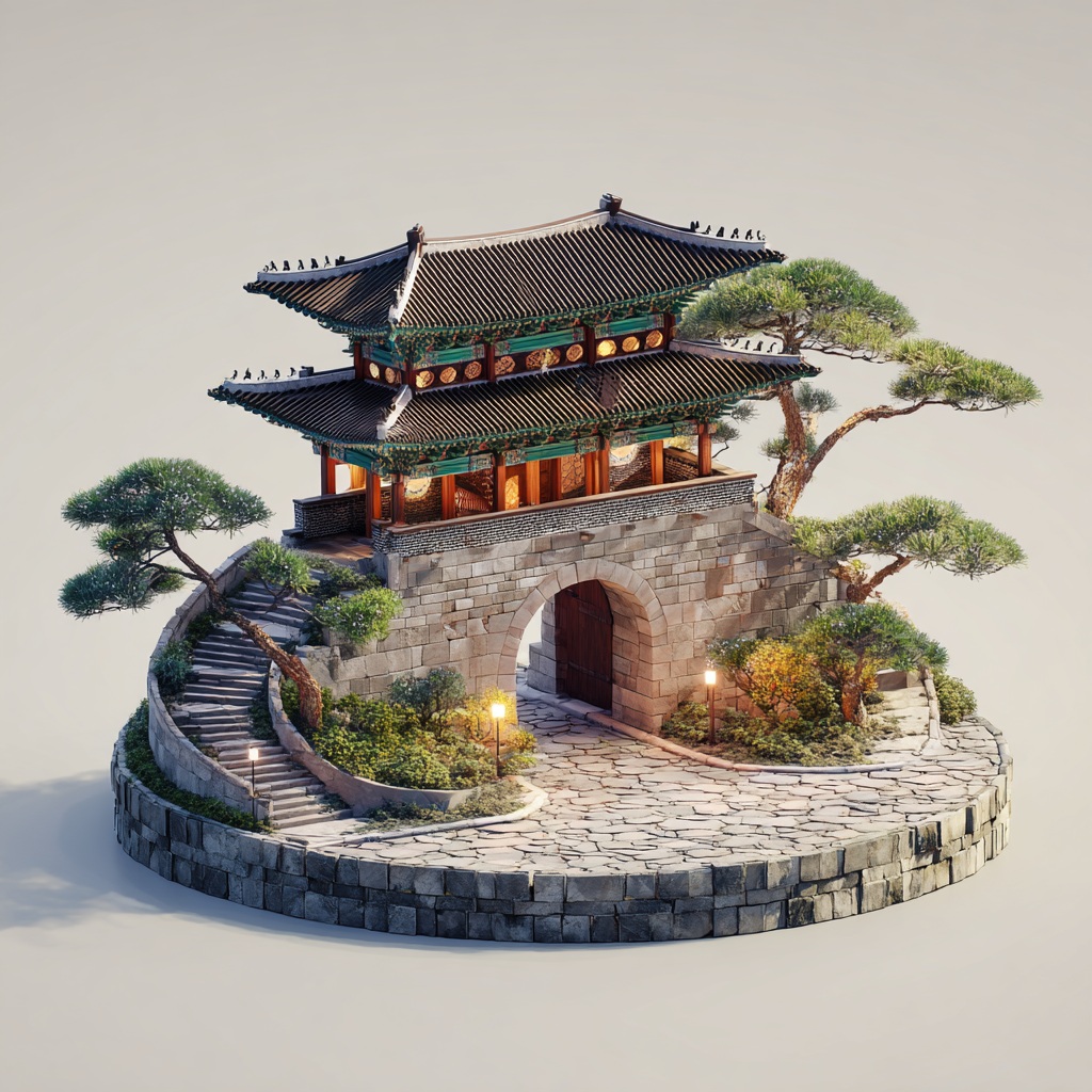 "type": "Korean traditional stone gate with wooden pavilion",