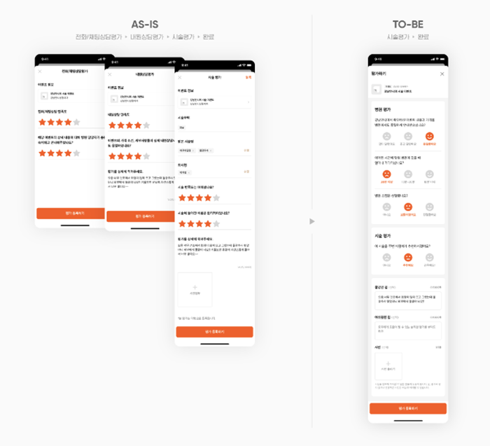사용성 테스트를 통해서 강남언니 팀은 3단계로 나누어진 시술 평가 단계를 하나의 페이지에서 한번에 평가할 수 있는 방법으로 개선하였습니다.