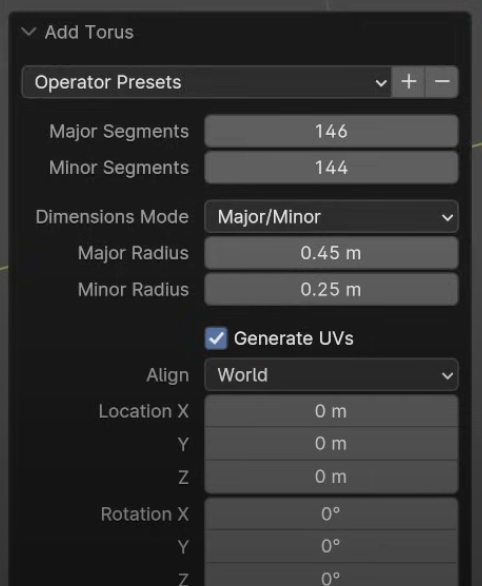 - Torus (도넛 모양)을 Shift+A로 생성한 후 왼쪽 하단의 Bar을 통해 Torus를 조정할 수 있습니다. 이를 통해 더 도넛 모양 같은 모형을 만들어봤습니다. 문제는 한 번 완료하고 다른 곳을 클릭하면 사라지게됩니다! (F9을 누르면 다시 볼 수 있다고 합니다.)